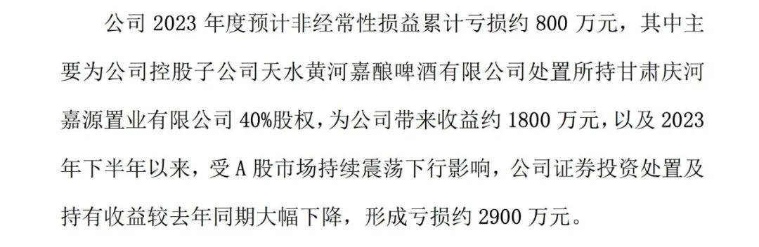 兰州黄河公告称,公司2023年度预计非经常性损益累计亏损约800万元,其中主要为公司控股子公司天水黄河嘉酿啤酒有限公司处置所持甘肃庆河嘉源置业有限公司40%股权,为公司带来收益约1800万元。但2023 年下半年以来,受A股市场持续震荡下行影响,公司证券投资处置及持有收益较去年同期大幅下降,形成亏损约2900万元。