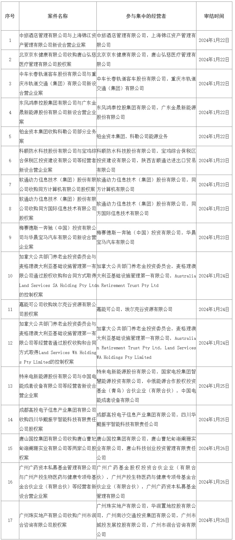 2024年1月22日—1月28日无条件批准经营者集中案件列表 见下: