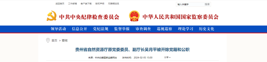 中央纪委国家监委网站2月5日消息,据贵州省纪委监委消息:经贵州省委批准,贵州省纪委监委对贵州省自然资源厅原党委委员、副厅长吴月平严重违纪违法问题进行了立案审查调查。