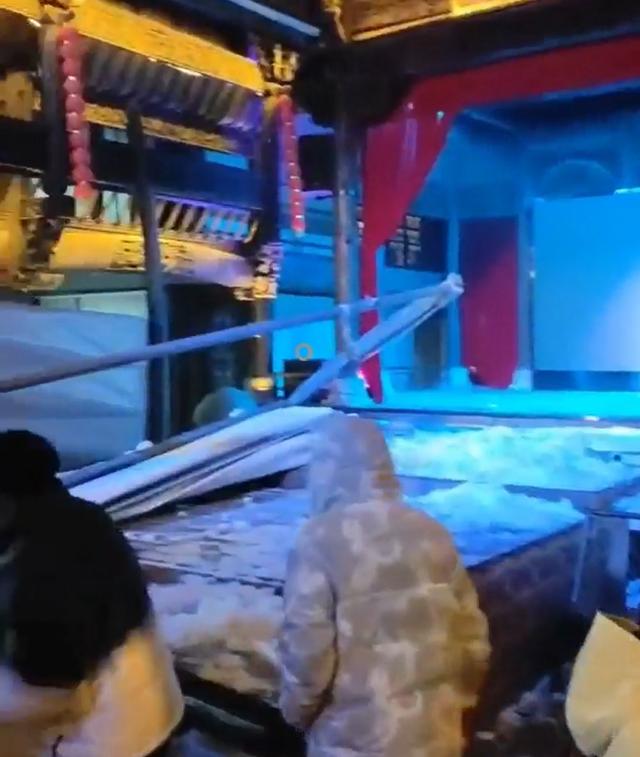 视频显示,景区楼体内部顶棚倒塌,坍塌处上方有积雪,疑有游客受伤,正被人搀扶站起。