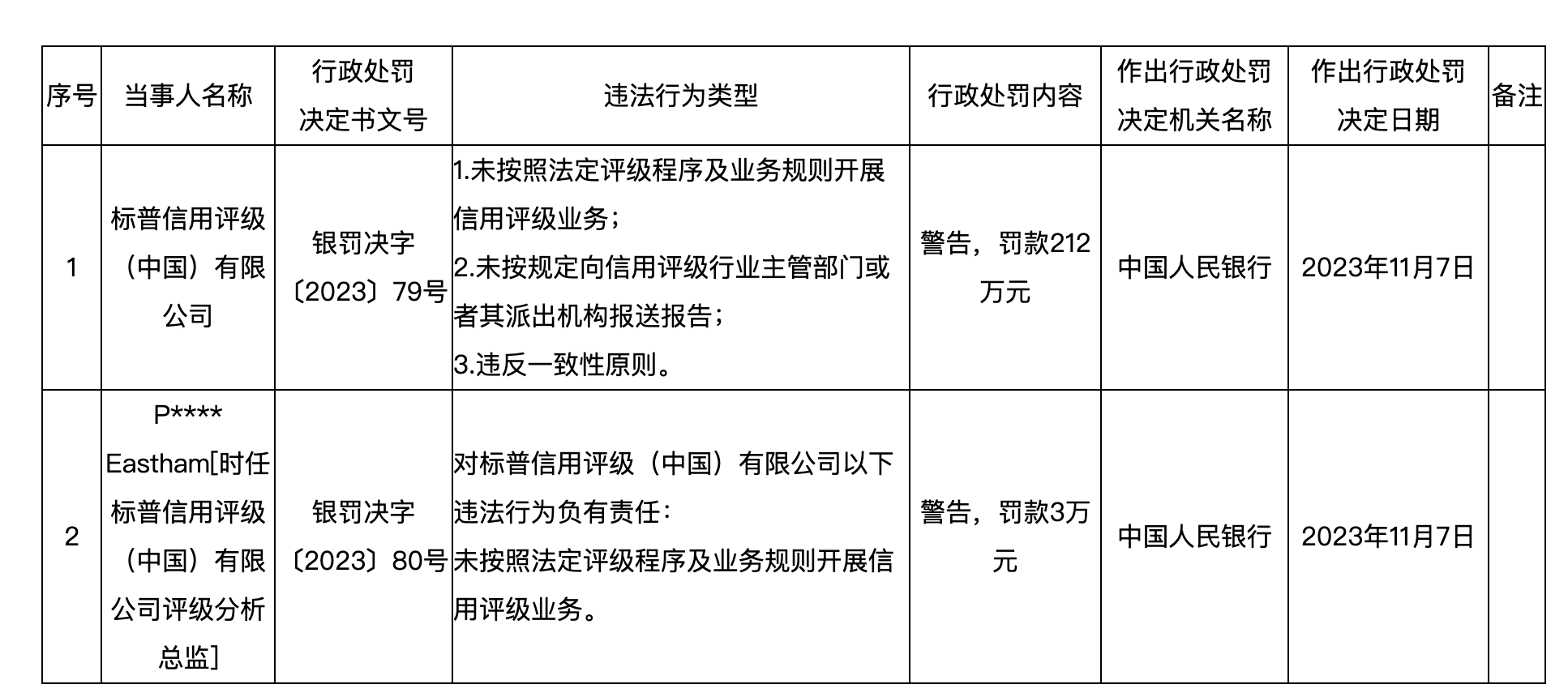 2月2日,中国人民银行发布银罚决字【2023】79-80号行政处罚决定书,对标普信用评级(中国)有限公司以及相关责任人的违法行为进行处罚,分别罚款212万元、罚款3万元。