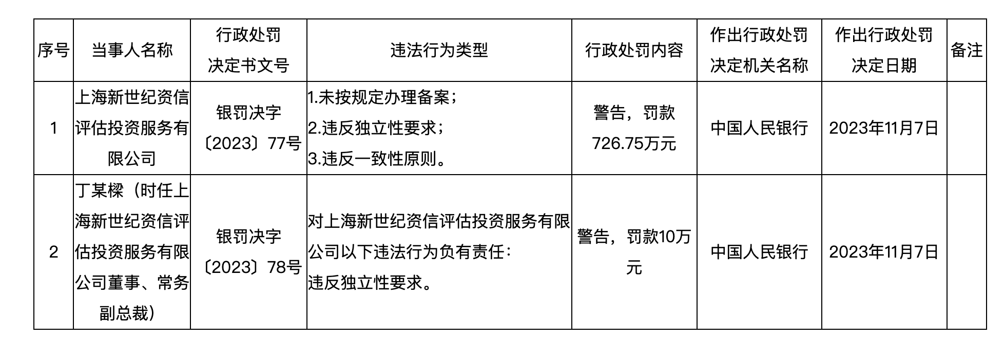 2月2日,中国人民银行发布银罚决字【2023】77-78号行政处罚决定书,对上海新世纪资信评估投资服务有限公司以及相关责任人的违法行为进行处罚,分别罚款726.75万元、罚款10万元。