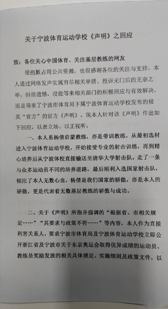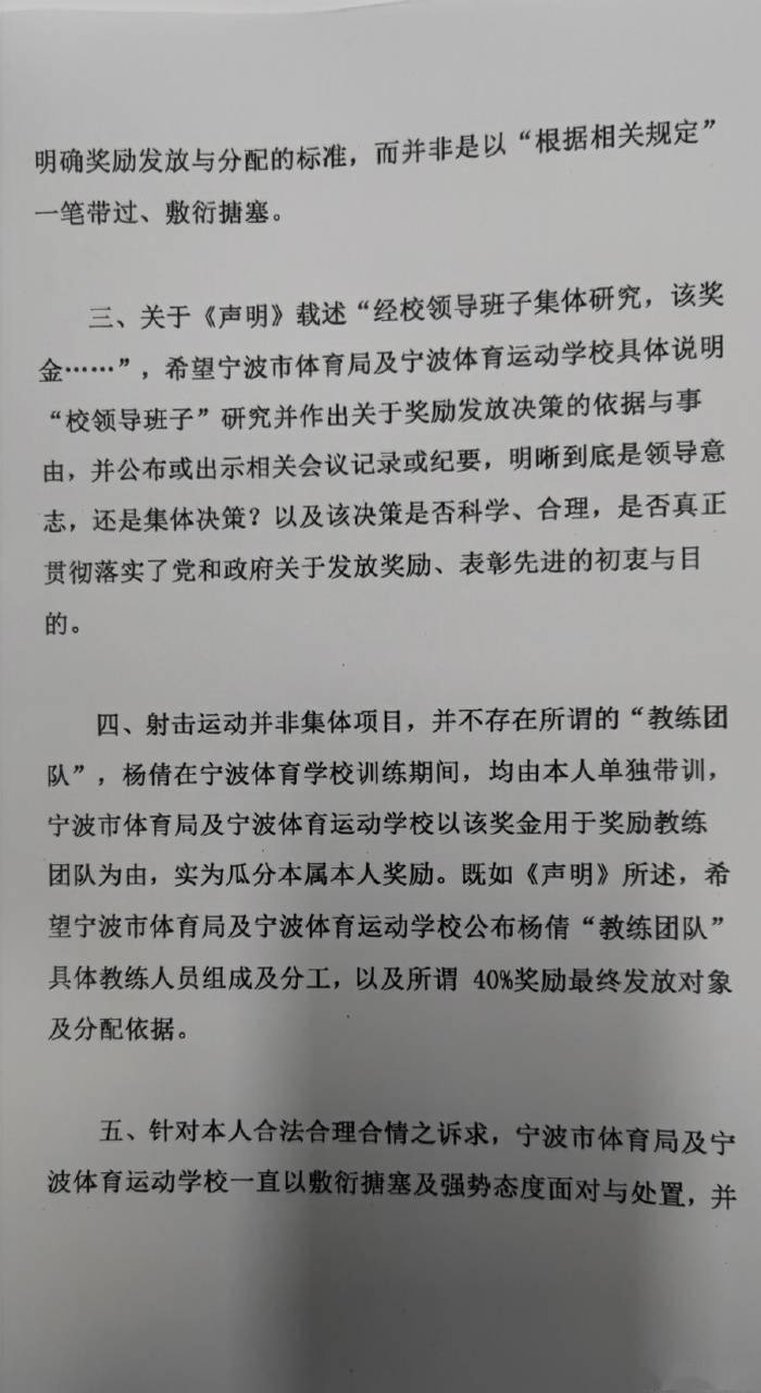 四、射击运动并非集体项目,并不存在所谓的“教练团队”,杨倩在宁波体育学校训练期间,均由本人单独带训,宁波市体育局及宁波体育运动学校以该奖金用于奖励教练团队为由,实为瓜分本属本人奖励。既如《声明》所述,希望宁波市体育局及宁波体育运动学校公布杨倩“教练团队”具体教练人员组成及分工,以及所谓 40%奖励最终发放对象及分配依据。