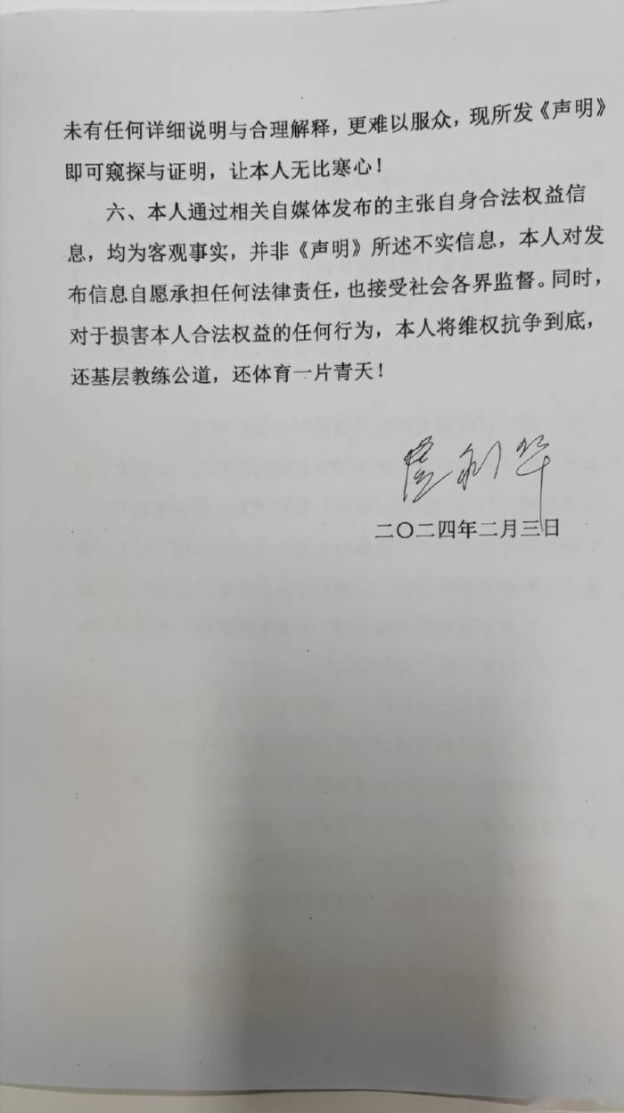 六、本人通过相关自媒体发布的主张自身合法权益信息,均为客观事实,并非《声明》所述不实信息,本人对发布信息自愿承担任何法律责任,也接受社会各界监督。同时对于损害本人合法权益的任何行为,本人将维权抗争到底,还基层教练公道,还体育一片青天!