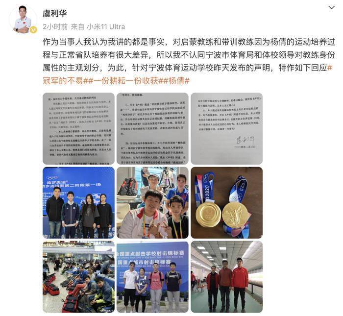 2月1日晚,曾担任东京奥运会射击女子10米气步枪项目冠军杨倩教练的虞利华,在社交媒体发文,向宁波市体育局和宁波体校“讨薪”。同日晚,宁波体育运动学校发布声明,称虞利华“发布的信息与事实不符”。