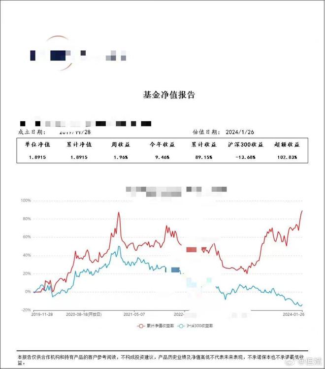 同时,但斌还在微博中晒出这只被起诉产品的业绩表现。根据提供的图片,这只被投资者起诉的私募产品是“第一只经历2021年2月10日高点回撤下来后再次创新高的产品”。产品净值报告显示,该产品成立于2019年11月28日,截至2024年1月26日,该产品今年以来收益为9.46%,累计收益为89.15%,超额收益为102.83%。