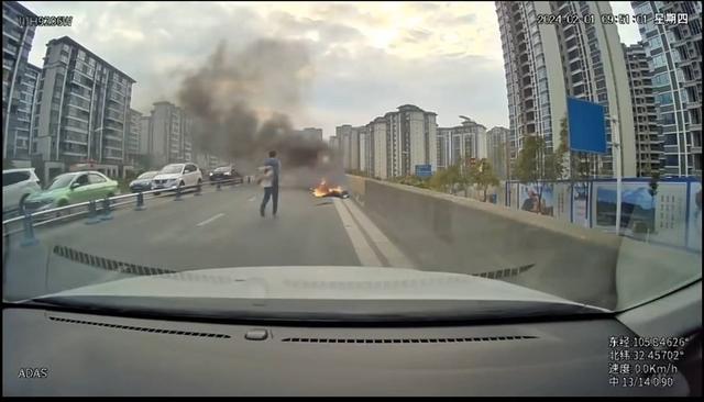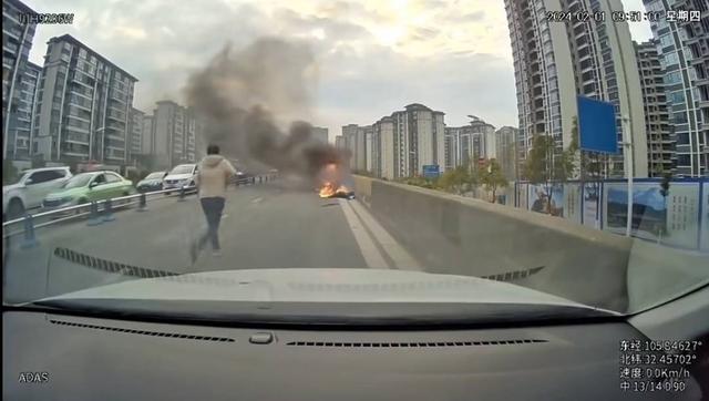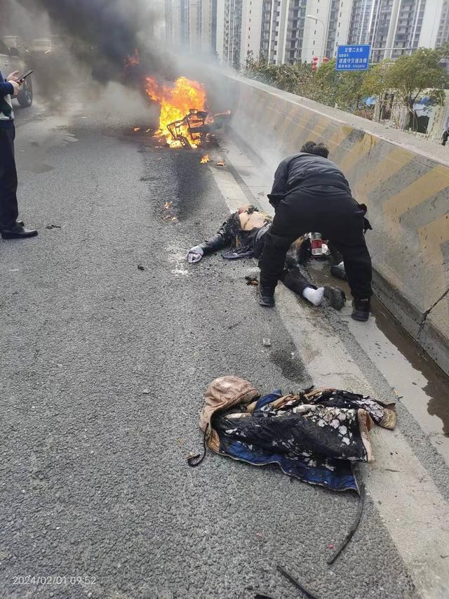 2月1日上午,四川广元一辆电瓶车在路上突发事故,燃起熊熊大火,火苗很快窜到了倒在地上的驾驶员身上。危急关头,一名年轻男子飞奔向前,脱下外套使劲拍打灭火,后来在过往市民的帮助下,一起将火扑灭。