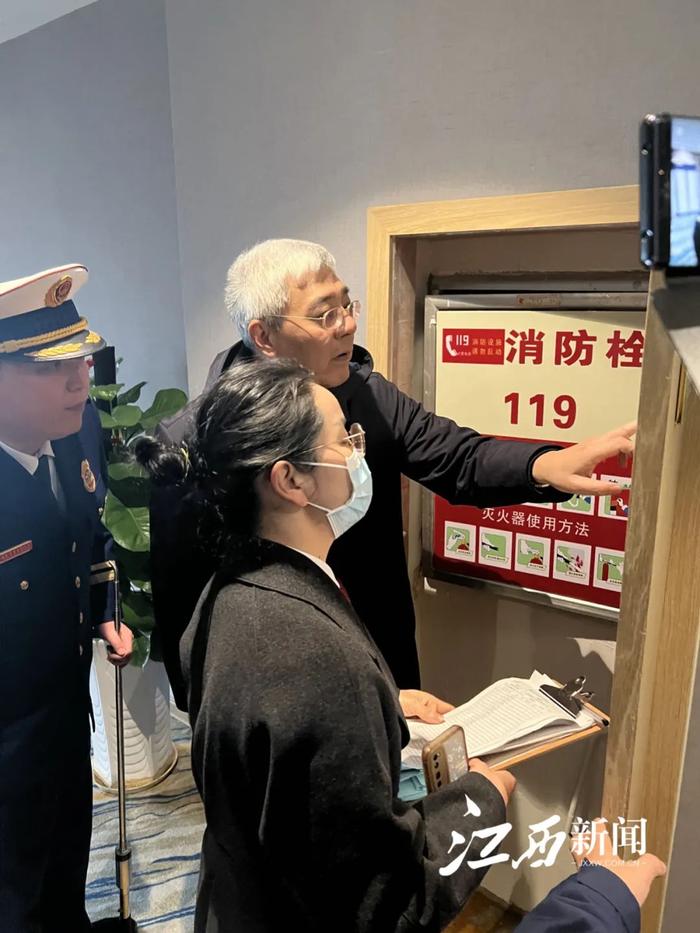 走进位于双港东大街的维也纳酒店,尹弘察看内部空间布局、消防设施配备、安全通道设置等情况,现场对酒店火灾烟感探测器进行测试,并指出了酒店消防设施标识不明显等问题。