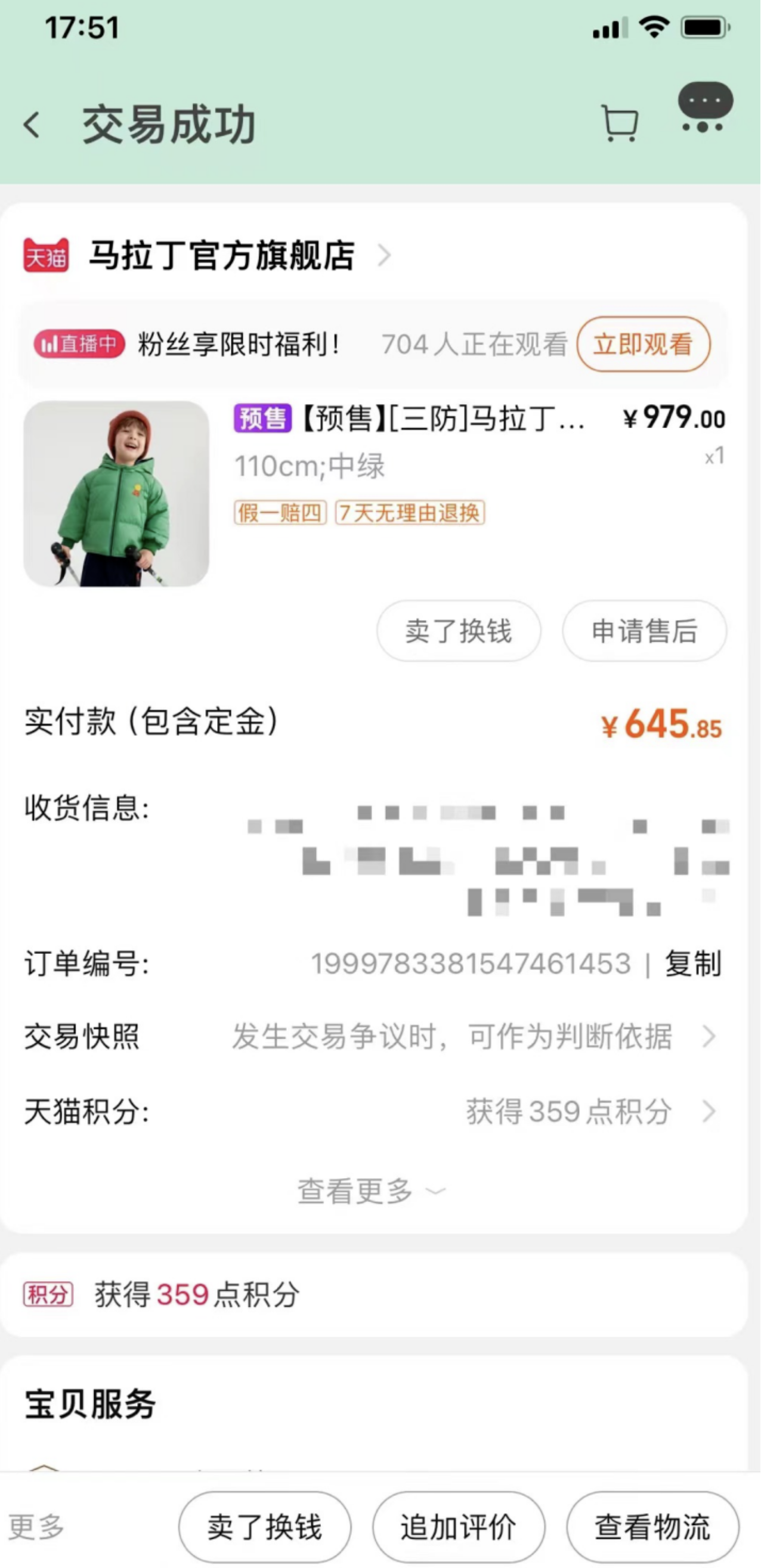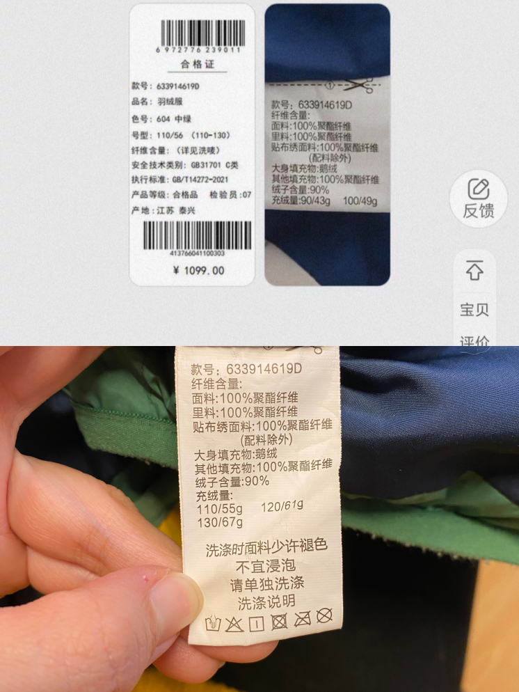 2023年10月31日,胡女士在马拉丁天猫旗舰店购买了一件货号为633914619D的马拉丁三防儿童羽绒服。