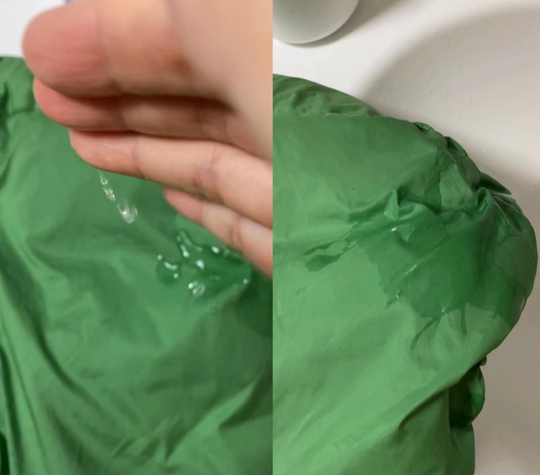 值得注意的是,据胡女士反映,客服所称的防泼水效果也有些“站不住脚”。当胡女士尝试用手捧起少量的水泼在该羽绒服的衣帽处时,羽绒服表面并未形成明显的水珠,而是迅速被水分润湿。