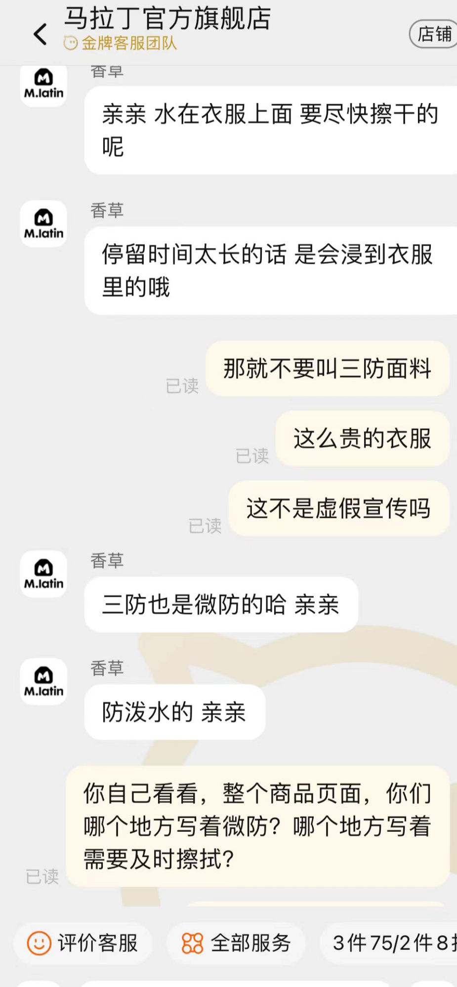 胡女士就衣物渗水问题向客服询问,客服则表示,“三防是微防”,水在衣服上要尽快擦干,停留时间太长的话会浸到衣服中去。对于商品宣传页面中的描述,客服则强调,是可以在一定程度上防水。