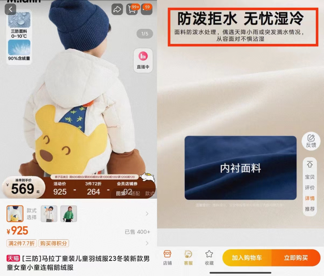 “一开始我就是因为我们家孩子现在是两岁多,有流口水的这个情况,所以我当时买羽绒服的时候,确实是想寻找一款三防的,就比如说它能表面不湿的这种羽绒服。”在浏览时,她注意到马拉丁品牌的这款儿童羽绒服标注有三防功能。“选择这款的原因,就是因为它的标题上第一个括号写就是三防。”