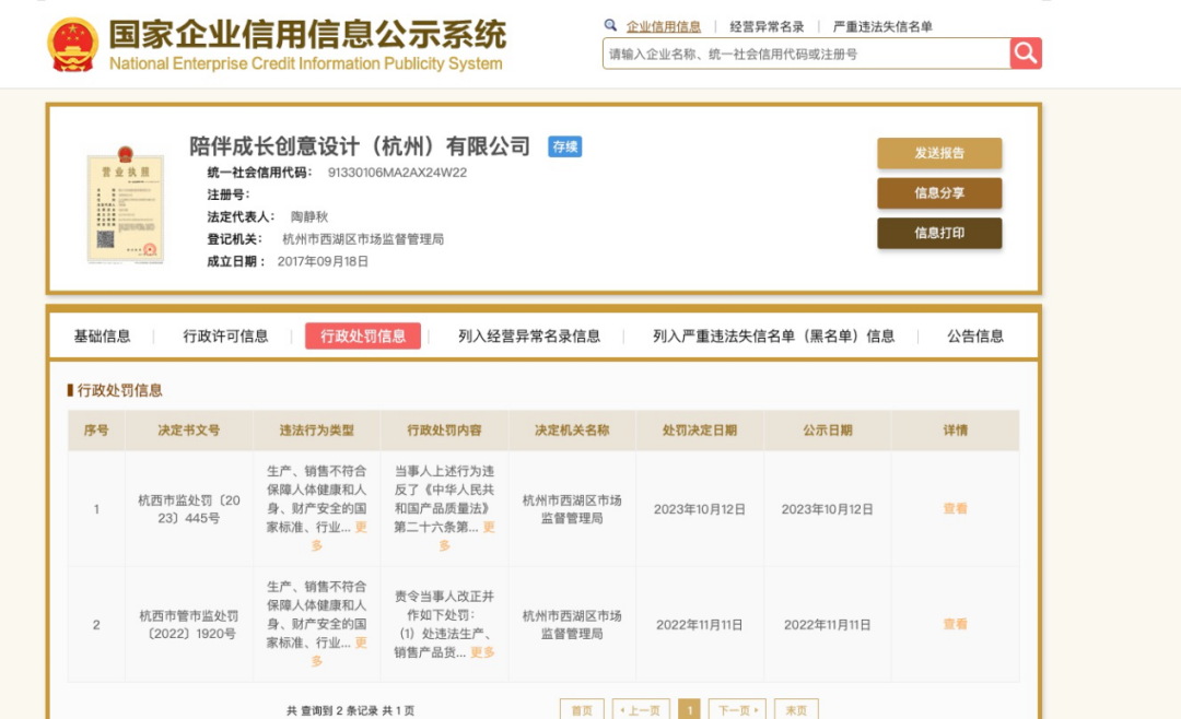 值得注意的是,公开信息显示,马拉丁商标所属公司陪伴成长创意设计(杭州)有限公司曾在2023年10月12日、2022年11月11月分别因生产、销售的产品耐湿摩擦色牢度值项目、pH值项目不合格被杭州市西湖区市场监督管理局作出行政处罚。
