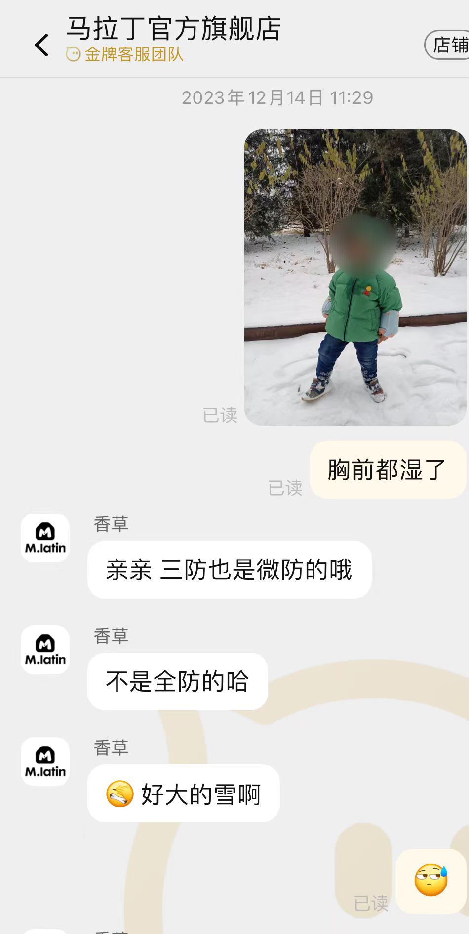 据胡女士描述,羽绒服收到后未经过清洗,而孩子在穿着这款羽绒服时,常常出现胸前被口水大片浸湿的情况。“之前北京下了一场大雪,北方的雪一般都是偏干的。但孩子在玩耍过程中,胸前一片口水浸湿的痕迹,帽子和肩膀也湿了。”孩子在雪地玩耍了十几二十分钟,羽绒服就被打湿,让胡女士对产品的质量感到气愤。