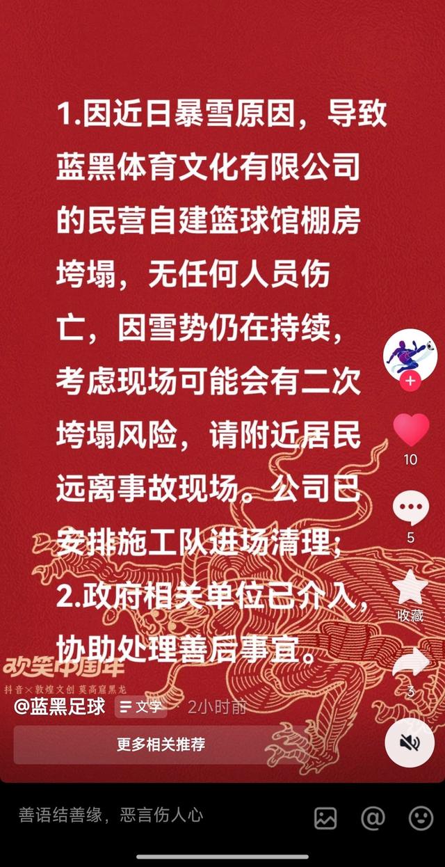 事发后,蓝黑体育公园通过其官方账号“蓝黑足球”回应称:因近日暴雪原因,导致蓝黑体育文化有限公司的民营自建篮球馆棚房垮塌,无任何人员伤亡,因雪势仍在持续,考虑现场可能会有二次垮塌风险,请附近居民远离事故现场,公司色安排施工队进场清理,政府相关单位已分人协助处理善后。