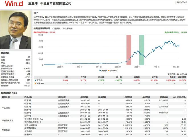 2012年9月,王亚伟“奔私”创立千合资本,担任执行董事、投资总监,很快千合资本就跻身百亿级私募的行列。不过,由于业绩表现不佳,规模也在百亿元上下浮动。