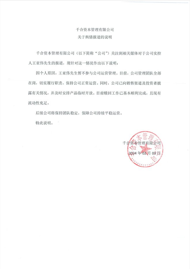 2月3日,千合资本管理有限公司(简称“千合资本”)发布《千合资本管理有限公司关于舆情报道的说明》称,因个人原因,王亚伟暂不参与公司运营管理。目前千合资本的管理团队全部在岗,切实履行职责,保持公司正常运营。同时,公司已向销售渠道及投资者披露有关情况,并及时安排产品临时开放,目前赎回工作已基本顺利完成,且现有流动性充足。