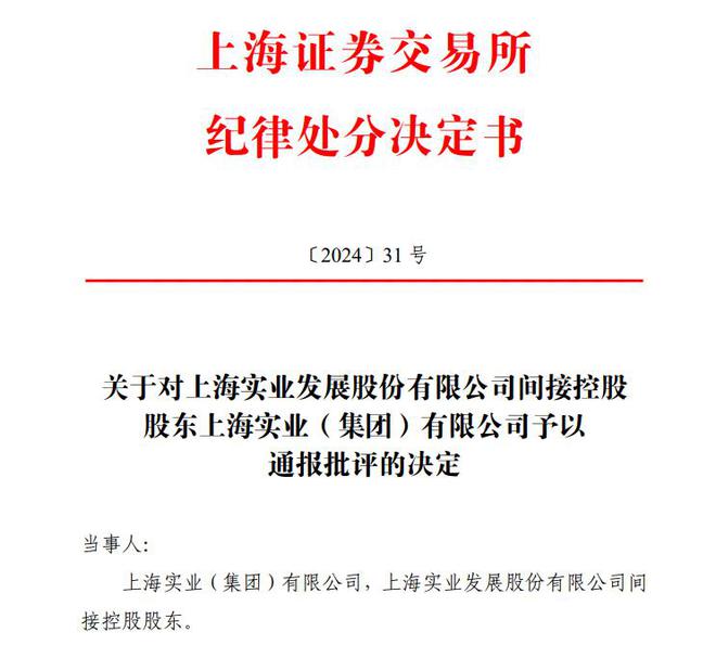 鉴于上述违规事实和情节,根据《股票上市规则》第 13.2.3条和《上海证券交易所纪律处分和监管措施实施办法》《上海证券交易所上市公司自律监管指引第 10 号——纪律处分实施标准》的有关规定,上交所作出如下纪律处分决定:对上实发展间接控股股东上实集团予以通报批评。