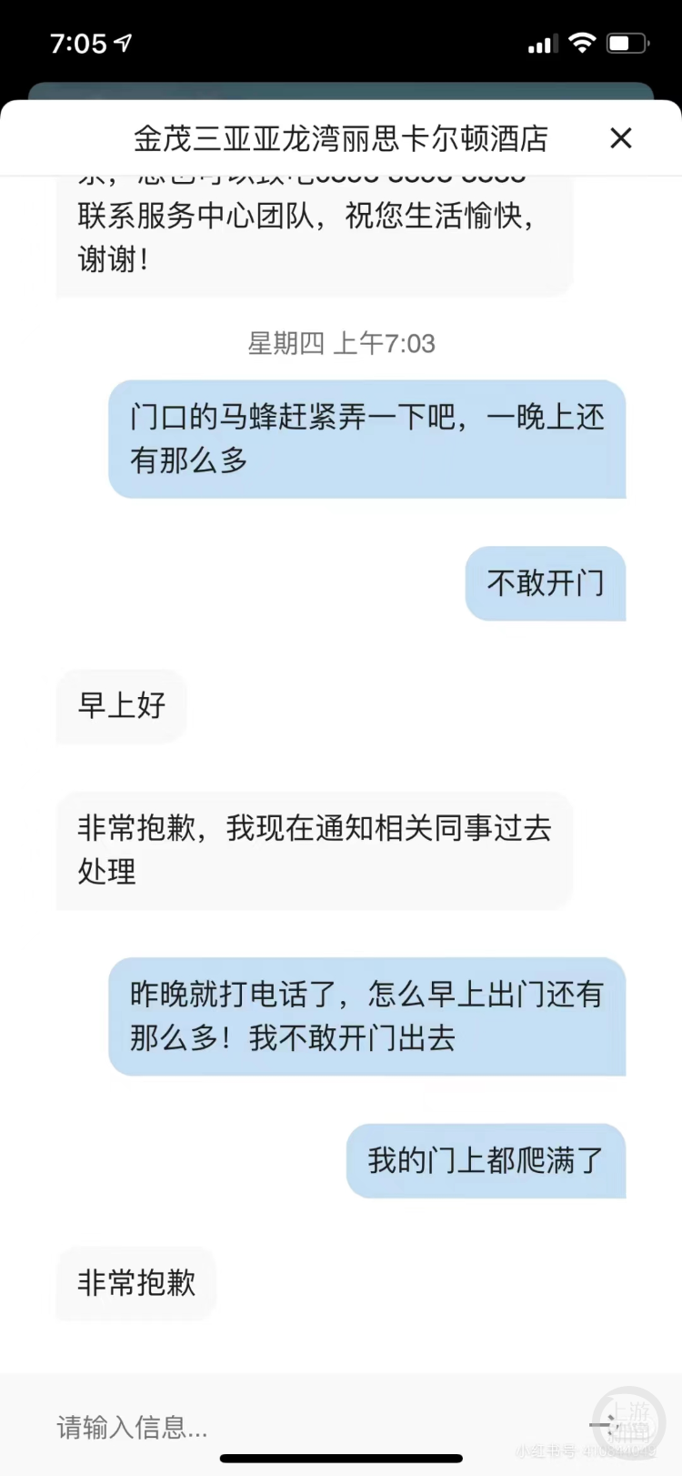 赵女士在小红书上发帖表示,“5500一晚三亚丽思卡尔顿酒店遭遇巨型马蜂团”,引发关注。赵女士表示,1月31日晚12点左右,她正在带娃睡觉,突然听到走廊有很大的嗡嗡声和人的尖叫声,吵得孩子睡不着,“拉开门一看,走廊里充满了巨型马蜂,黑压压一大片,一只马蜂有小拇指那么大,而且特别多,团在一起。我以0.01秒的速度关上门,心吓得怦怦跳。房间里就我和小孩在,(孩子)爸爸下楼有事了,万一放一只进来咬到后果不堪设想。”