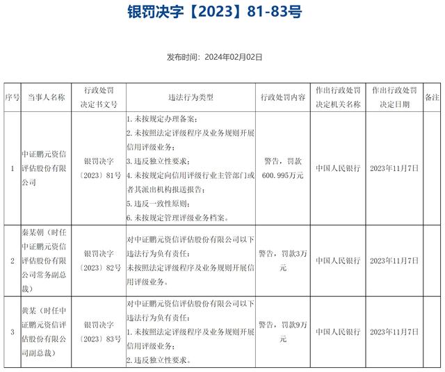 针对上述违法行为,人民银行对中证鹏元警告并罚款600.995万元,对时任公司常务副总裁秦某朝警告并罚款3万元,对时任公司副总裁黄某警告并罚款9万元。