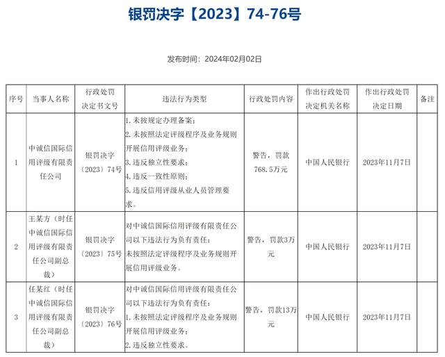 针对上述违法行为,人民银行对中诚信国际警告并罚款768.5万元,对时任公司副总裁王某方警告并罚款3万元,对时任公司副总裁任某红警告并罚款13万元。