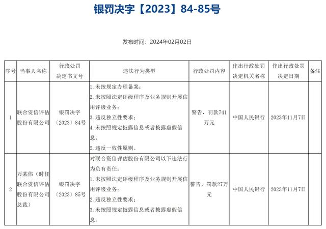 针对上述违法行为,人民银行对联合资信警告并罚款741万元,对时任公司总裁万某伟警告并罚款27万元。