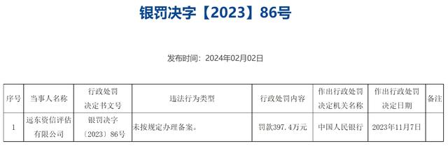 行政处罚信息显示,远东资信评估有限公司存在“未按规定办理备案”的违法行为,人民银行对其罚款397.4万元。