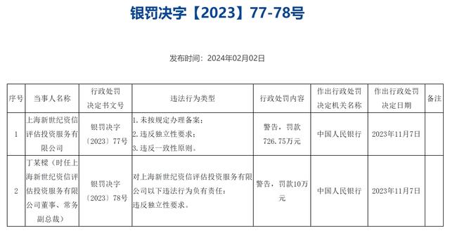 行政处罚信息显示,上海新世纪资信评估投资服务有限公司存在三项违法行为:一是未按规定办理备案;二是违反独立性要求;三是违反一致性原则。