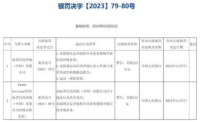 针对上述违法行为,人民银行对标普中国警告并罚款212万元,对时任公司评级分析总监P**** Eastham警告并罚款3万元。