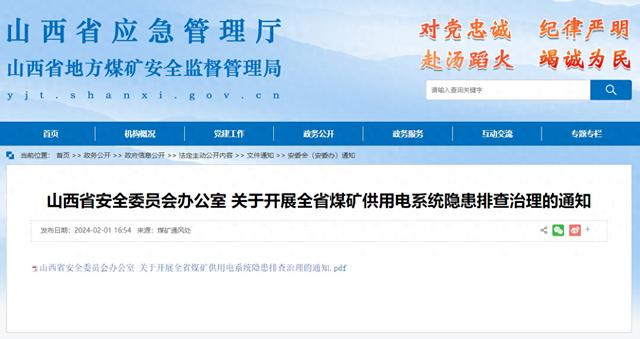 据山西省应急管理厅网站消息,2月1日,山西省安全委员会办公室印发《关于开展全省煤矿供用电系统隐患排查治理的通知》。