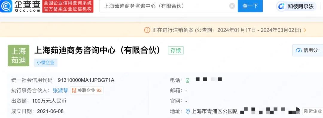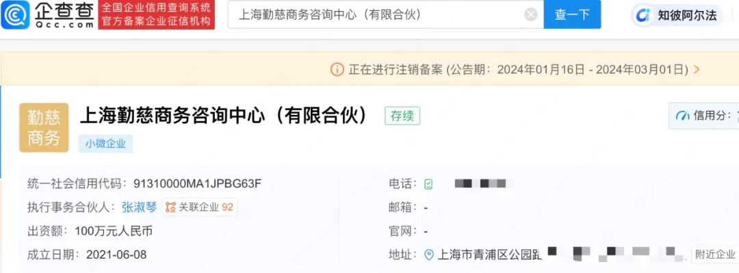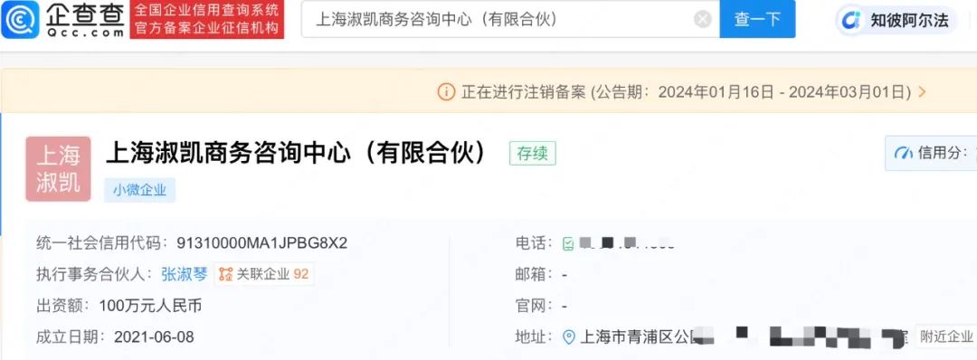 企查查APP显示,近日,上海勤慈商务咨询中心(有限合伙)、上海茹迪商务咨询中心(有限合伙)、上海淑凯商务咨询中心(有限合伙)、上海凯的商务咨询中心(有限合伙)新增注销备案信息,注销原因均为决议解散,公告日期截至3月初。上述4家咨询中心均成立于2021年,出资额均为100万人民币,由张淑琴(张庭)担任执行事务合伙人并持股99%。