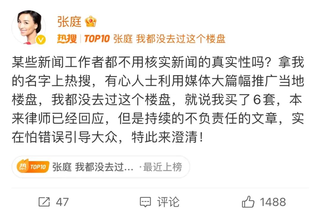 2月1日,张庭就买六套房一事发文:“拿我的名字上热搜,有心人士利用媒体大篇幅推广当地楼盘,我都没去过这个楼盘,就说我买了6套,本来律师已经回应,但是持续的不负责任的文章,实在怕错误引导大众,特此来澄清!”