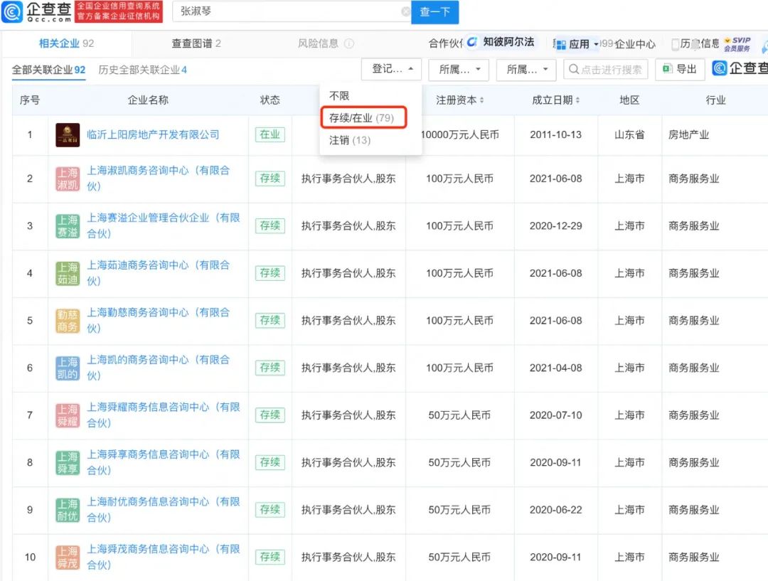 目前,除上述拟注销企业外,张庭名下共有75家企业为存续状态,包括上海达尔威贸易有限公司、上海淘不庭文化传媒有限公司、临沂上阳房地产开发有限公司等。