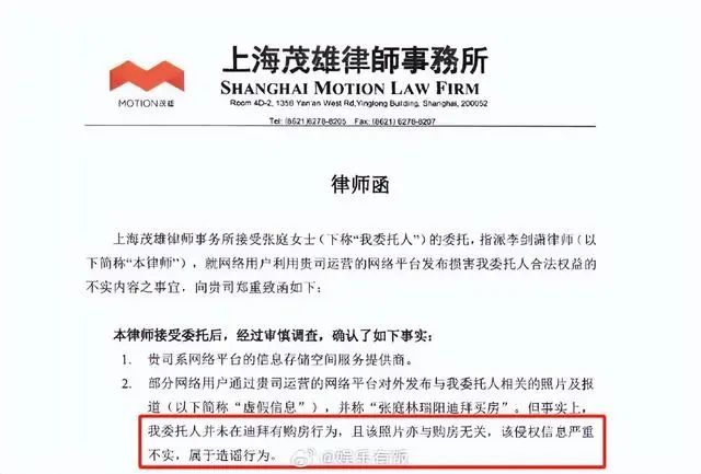 随后,张庭委托律师发布律师函说明,称“我委托人并未在迪拜有购房行为,且该照片亦与购房无关,该侵权信息严重不实,属于造谣行为。”