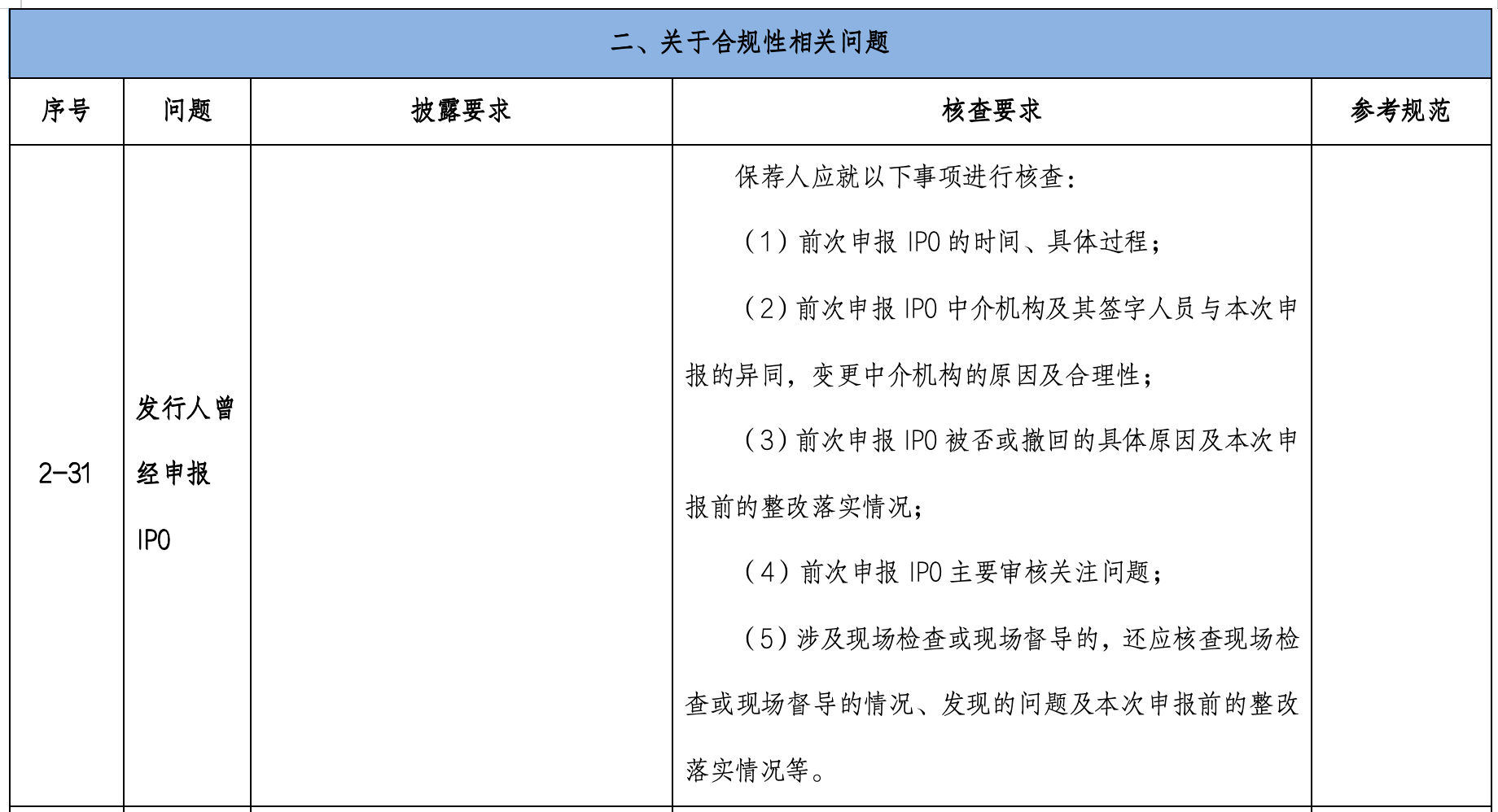 2023年3月,上交所发布《上海证券交易所发行上市审核业务指南第4号——常见问题的信息披露和核查要求自查表》也明确过,发行人曾经申报IPO的,保荐人应就以下事项进行核查:前次申报IPO的时间、具体过程;前次申报IPO中介机构及其签字人员与本次申报的异同,变更中介机构的原因及合理性;前次申报IPO被否或撤回的具体原因及本次申报前的整改落实情况;前次申报IPO主要审核关注问题;涉及现场检查或现场督导的,还应核查现场检查或现场督导的情况、发现的问题及本次申报前的整改落实情况等。此次上交所,在《审核动态》重申了核查要求。
