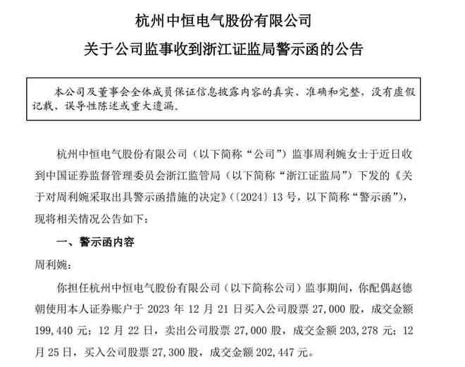 2月1日,中恒电气公告称,公司监事周利婉近日收到浙江证监局下发的《关于对周利婉采取出具警示函措施的决定》(〔2024〕13号,下称“警示函”)。