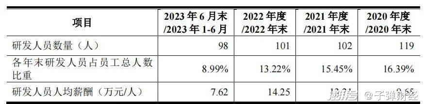 由于研发投入的减少,鸿禧能源研发人员数量也在逐年递减。报告期内,公司研发人员分别为119人、102人、101人、98人。同期,公司研发人员平均薪资也出现下降。