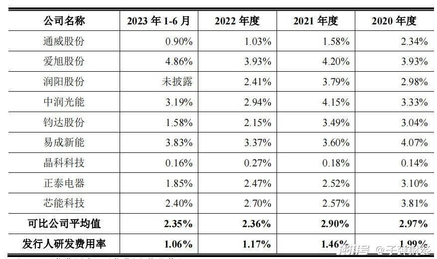 报告期内,公司研发费用率分别为1.99%、1.46%、1.17%、1.06%。作为对比,同期可比公司平均研发费用率分别为2.97%、2.90%、2.36%、2.35%。