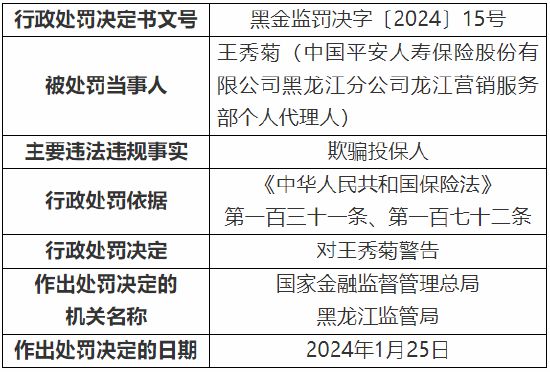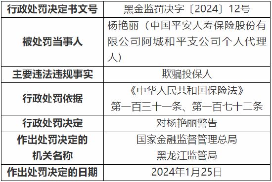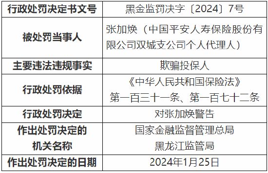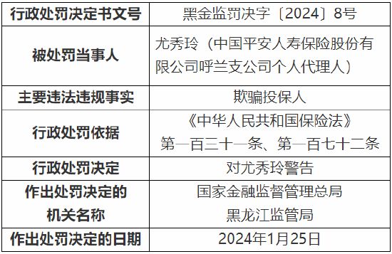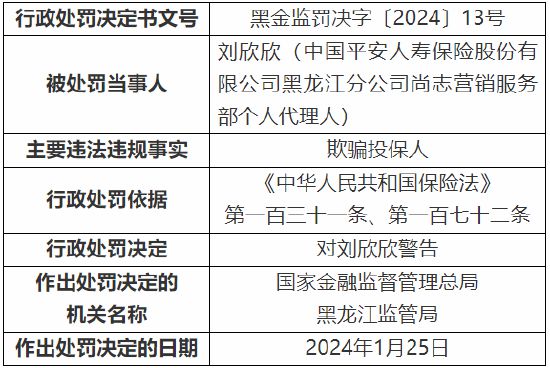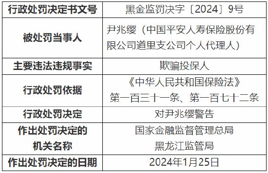 国家金融监督管理总局黑龙江监管局行政处罚信息公开表显示,国家金融监督管理总局黑龙江监管局共发布9张行政处罚信息公开表,被处罚当事人均是中国平安人寿保险股份有限公司个人代理人。罚单信息显示,共有9名个人代理人因欺骗投保人,被监管警告。