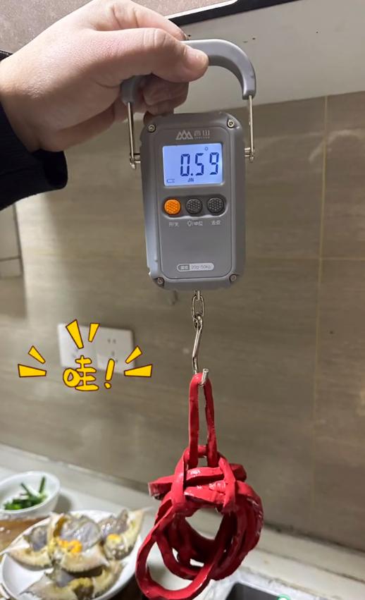 该女子发布的视频显示,位于江苏徐州的船长海鲜巨融店,购买了母蟹和对虾,螃蟹花费了289元。她将皮筋称重,显示重量为0.59千克。“一只螃蟹才4两,皮筋6两,这顿饭吃得我消化不良。”