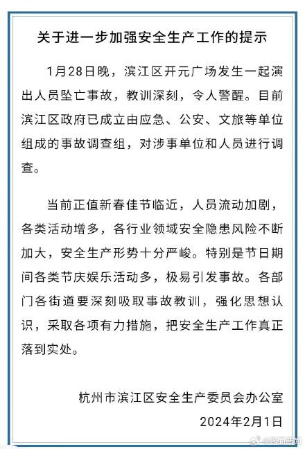 近日,浙江杭州滨江区开元广场一女子杂技表演时,不慎从数米高空坠落引关注。滨江发布 微博2月1日发布通报称,1月28日晚,滨江区开元广场发生一起演出人员坠亡事故,教训深刻,令人警醒。目前滨江区政府已成立由应急、公安、文旅等单位组成的事故调查组,对涉事单位和人员进行调查。