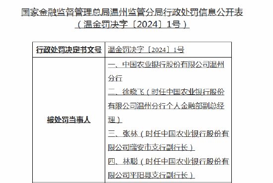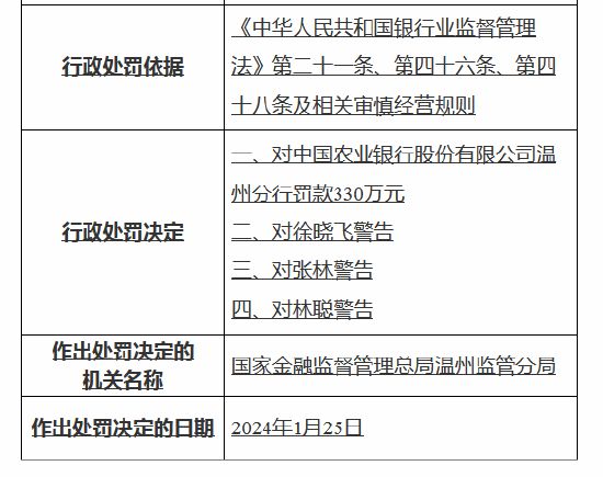 2月1日,国家金融监督管理总局网站发布行政处罚信息公开表显示,中国农业银行股份有限公司温州分行因九项违规事实被罚330万元,3名高管收罚单。