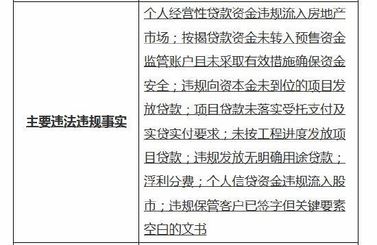 行政处罚信息公开表显示,中国农业银行股份有限公司温州分行的违法违规事实包括:个人经营性贷款资金违规流入房地产市场;按揭贷款资金未转入预售资金监管账户且未采取有效措施确保资金安全;违规向资本金未到位的项目发放贷款;项目贷款未落实受托支付及实贷实付要求;未按工程进度发放项目贷款;违规发放无明确用途贷款;浮利分费;个人信贷资金违规流入股市;违规保管客户已签字但关键要素空白的文书。