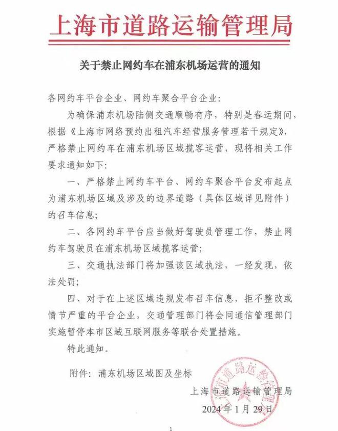 1月29日,上海市道路运输管理局下发《关于禁止网约车在浦东机场运营的通知》,其中明确“严格禁止网约车在浦东机场区域内揽客运营”,引发上海市民游客热议。