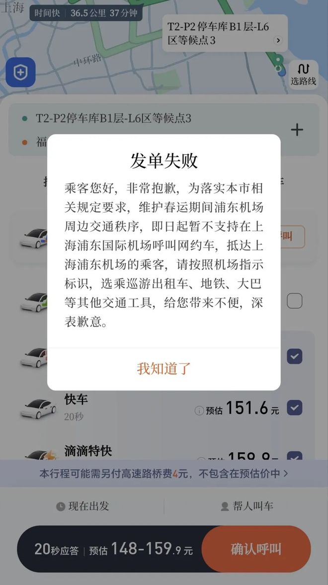 打开滴滴出行,定位上海浦东机场T2航站楼,输入位于浦东新区的终点,点击下单后显示发单失败,页面称,“为落实上海相关规定要求,维护春运期间浦东机场周边交通秩序,即日起暂不支持在上海浦东国际机场呼叫网约车,抵达上海浦东机场的乘客,请按照机场指示标识,选乘其他交通工具出行。”