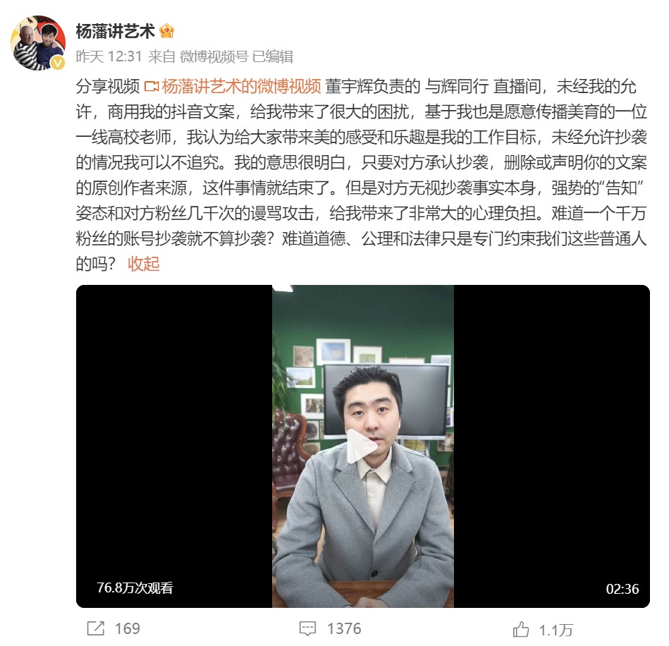 近日,拥有百万粉丝的人文艺术博主杨藩发布视频称,“与辉同行”主播董董抄袭自己的视频文案,再度将董宇辉直播团队推上热搜。