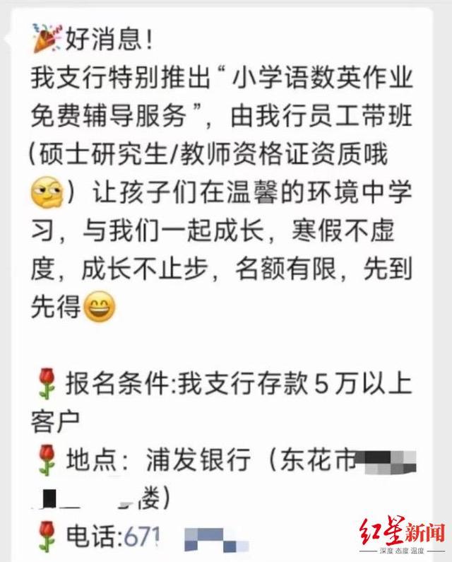 近日,网上流传信息显示,浦发银行北京东花市支行推出了针对小学语数英作业的免费辅导服务,由该行员工带班,希望孩子们在温馨的环境中学习,不虚度寒假。但报名条件为在该行存款5万元以上的客户。对此有网友调侃,“存款500万岂不是天天辅导了?”还有网友说“辅导费比5万存款的利息高多了,这个划算”。