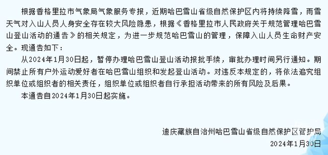 1月30日,迪庆藏族自治州哈巴雪山省级自然保护区管护局在官方微信账号上发布通告,明确暂停办理哈巴雪山登山活动报批工作,通告自1月30日起实施。