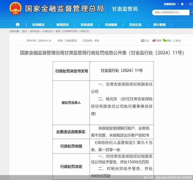 1月31日,国家金融监督管理总局甘肃监管局公布的行政处罚信息显示,甘肃吉安保险经纪有限责任公司,因未按规定使用银行账户、业务档案不完整、未按规定出示客户告知书,被警告并罚款1.5万元;杨光宗被警告并罚款0.9万元。