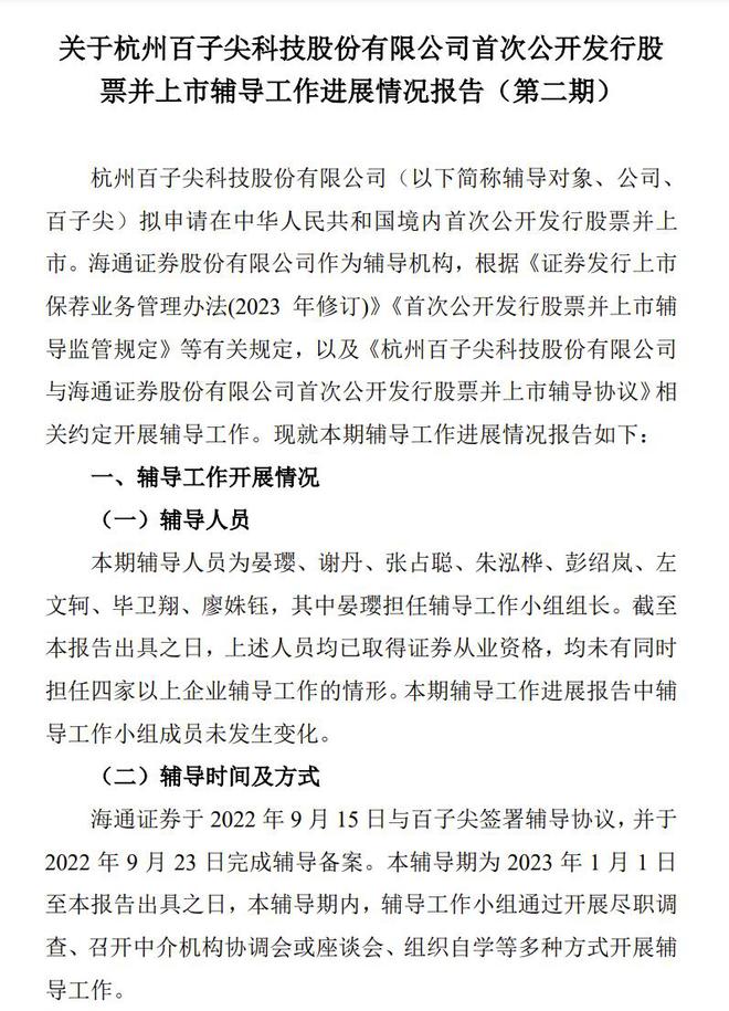 根据海通证券公告,2022年9月15日,百子尖与海通证券签署了辅导备案协议,并于2022年9月23日完成辅导备案,辅导人员为晏璎、谢丹、张占聪、朱泓桦、彭绍岚、左文轲、毕卫翔、廖姝钰,其中晏璎担任辅导工作小组组长。